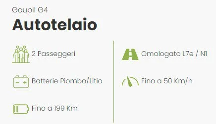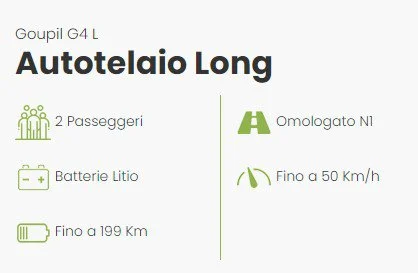 Il Goupil G4 è un veicolo commerciale modulare e personalizzabile. Due chassis di basee per combinare elementi unici e performanti. Veicolo elettrico da lavoro, il Goupil G4 Chassis ha una cabina chiusa biposto, con ottima visuale di strada e comfort di guida. È un mezzo da lavoro agile e robusto, adatto al trasporto merci e attrezzature. Il telaio base può essere allestito con varie configurazioni. Dall'allestimento cassone, fisso o ribaltabile, a quello furgone o misto.